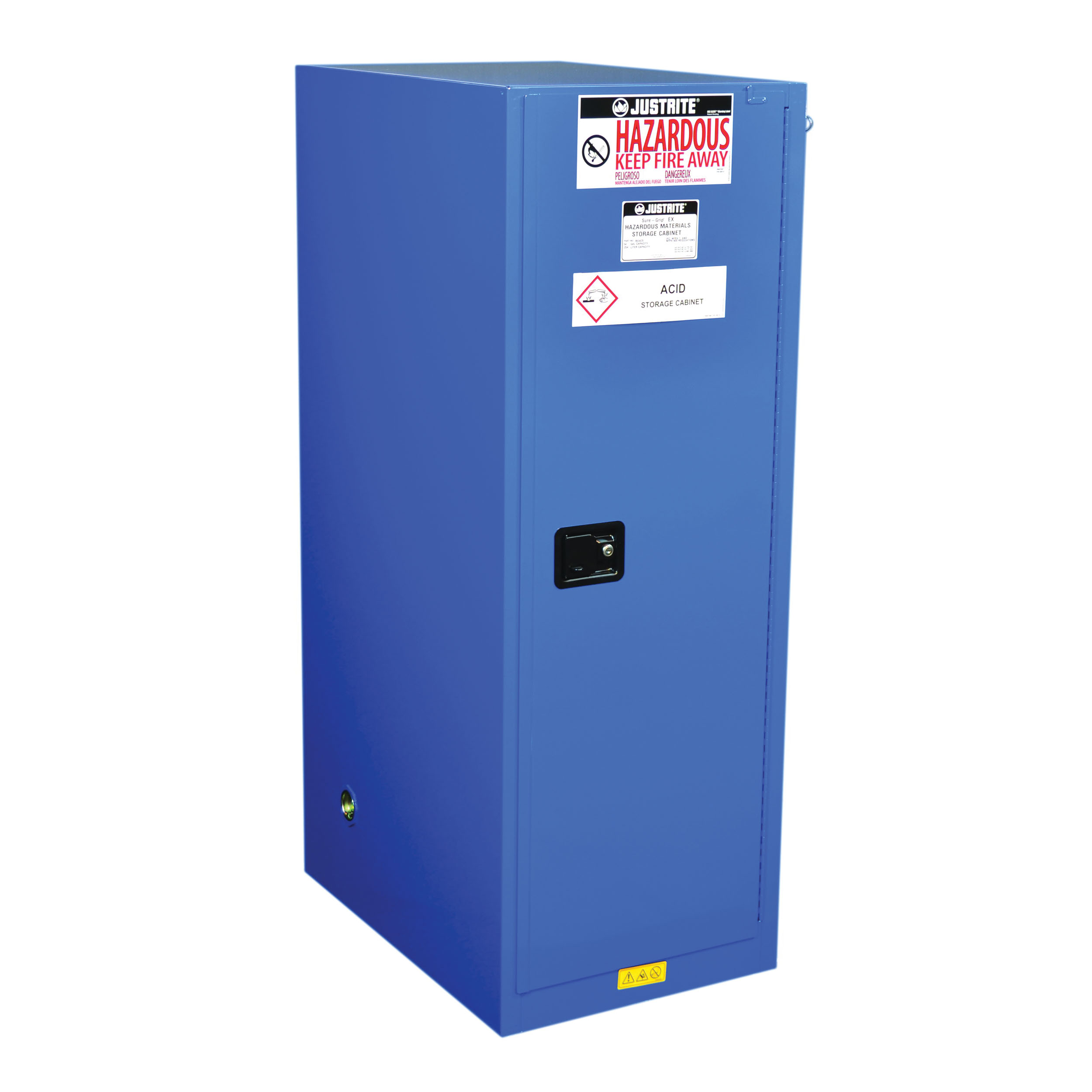 Justrite Corrosive Safety Cabinet, Deep Slimline, Series: Sure-Grip EX, 54 gal Capacity, 65 in Height, 23-1/4 in Width, 34 in Depth, Self-Close Door, 1 Door, 3 Shelves, 18 ga Cold Rolled Steel, Powder Coated, Royal Blue, U-Loc Handle