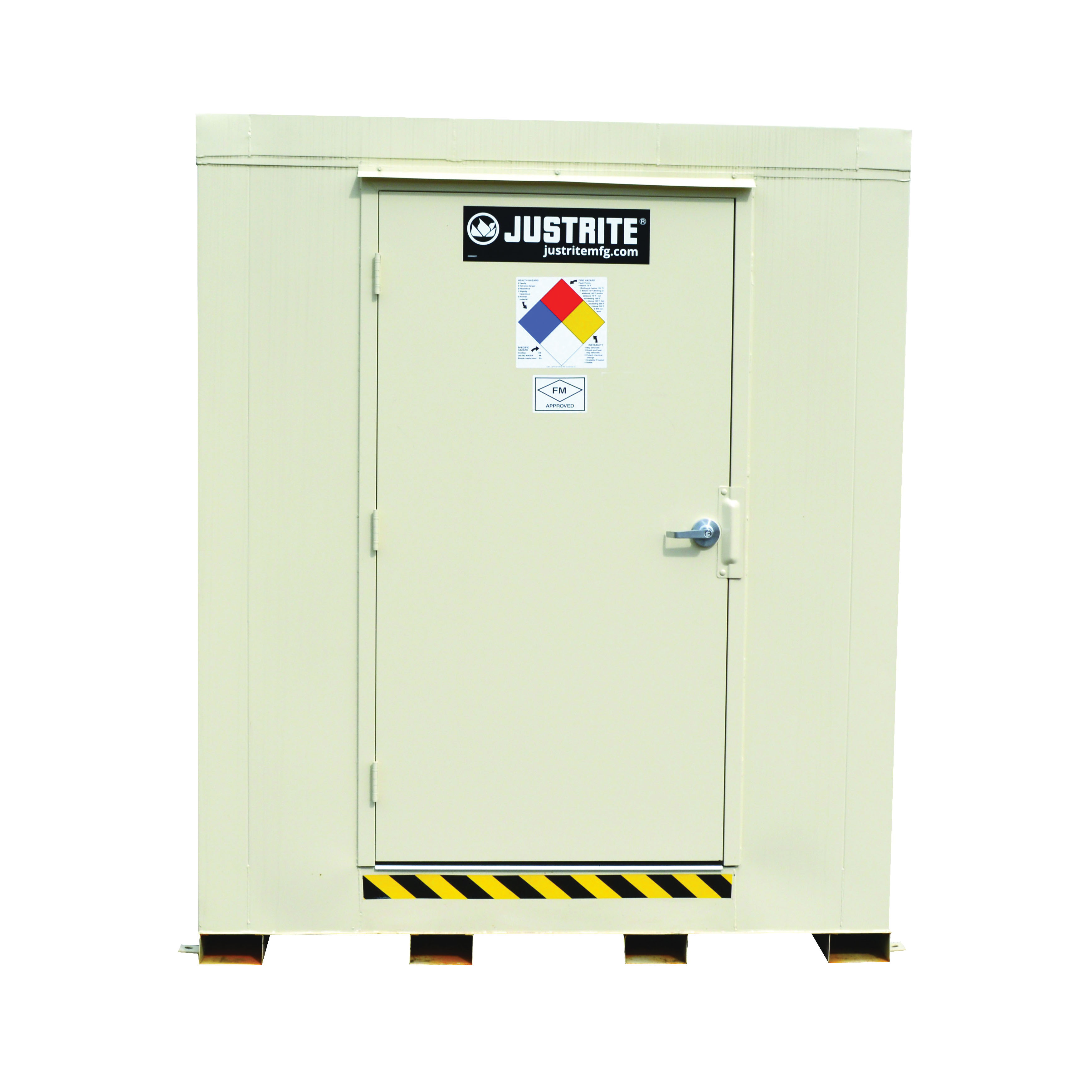 Justrite Outdoor Safety Locker, Fire Rating: 4 hr, (6) 55 gal Drum, 6000 lb Load, 105 gal Sump, 97 in Height, 88 in Width, 64 in Depth, Fire-Rated Door, 1 Doors, Heavy Gauge Steel, Bone