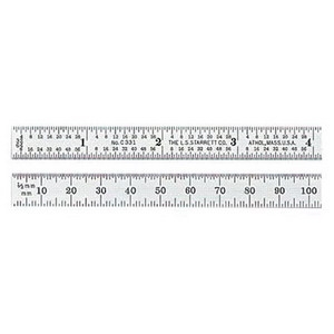 Starrett Precision Rule, Spring Tempered, Series: C636, 150 mm Length, 19 mm Width, 1.2 mm Thickness, Measuring System: Imperial/Metric, Graduations: #36 to 32nds and 1/2mm on One Side, 64ths and mm on Reverse Side, Black Markings, Steel, Silver