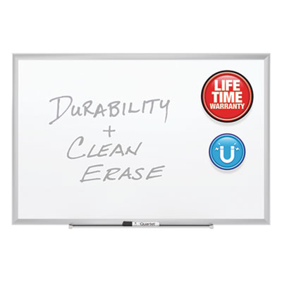 Ultra-durable, ultra-smooth board with DuraMax® porcelain surface will not scratch, dent, stain or ghost. Delivers superior performance when collaboration is needed in high-profile, heavy-use office environments. Magnetic surface doubles as bulletin board. Easy-to-clean writing surface requires minimal use of Quartet® cleaning solutions. Unique mounting system, quickly and easily secures board to wall. Stylish frame complements high-profile interiors. Includes four Quartet® dry-erase markers.