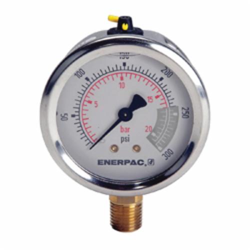 Enerpac Hydraulic Pressure Gauge, Series: G, 0 to 300 psi, 1/4 in FNPT, 2-1/2 in Dial Diameter, +/- 1.5% Full Scale Accuracy, Graduations: 5 to 50 psi, Liquid Filled: Glycerin, Lower Mount, Stainless Steel Case, Silver, 84 mm H x 37 mm D